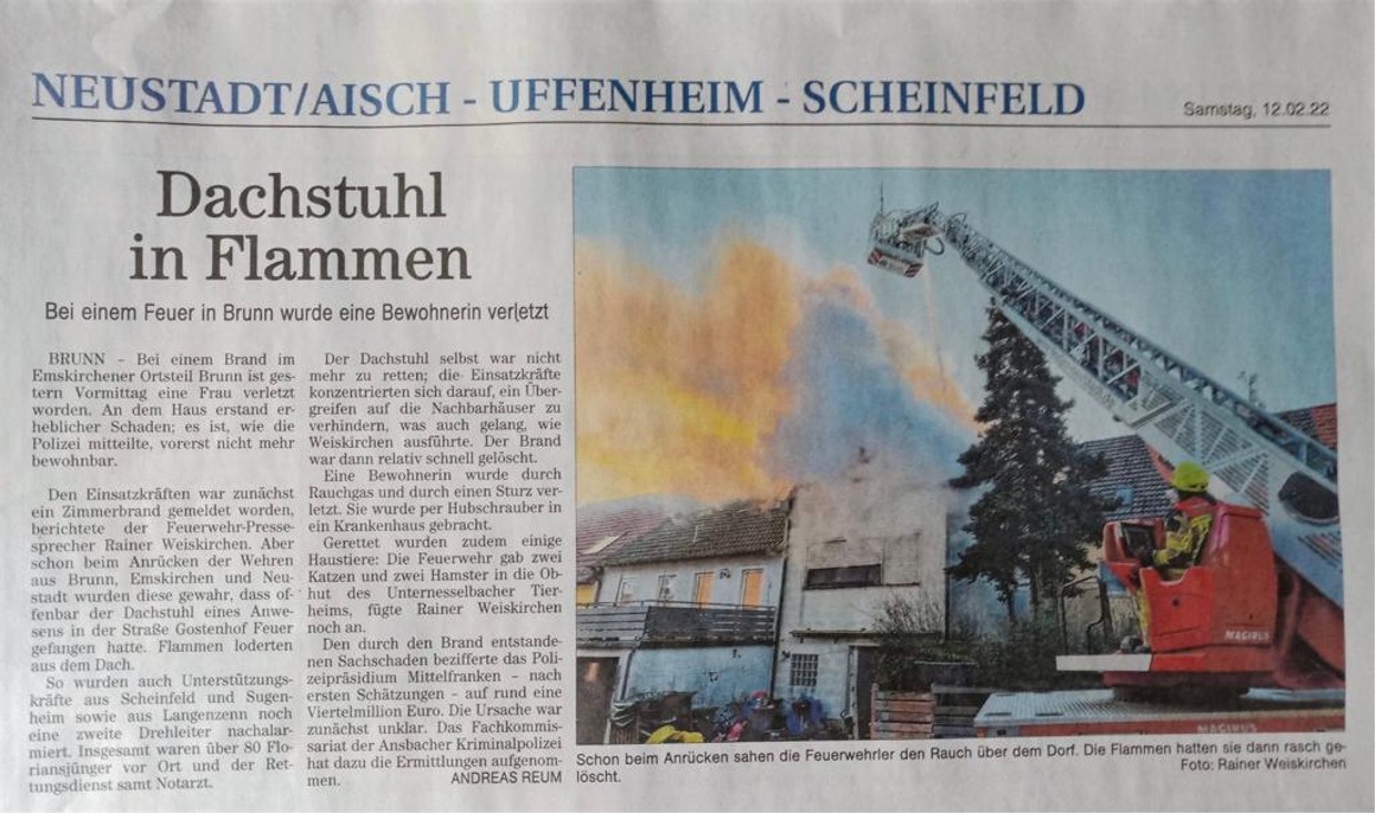 Nr. 6 - 11.2.2022 - UG ÖEL: Dachstuhlbrand in BrunnDauer 30 Min (9.33 - 12:15 Uhr) 5 Leute