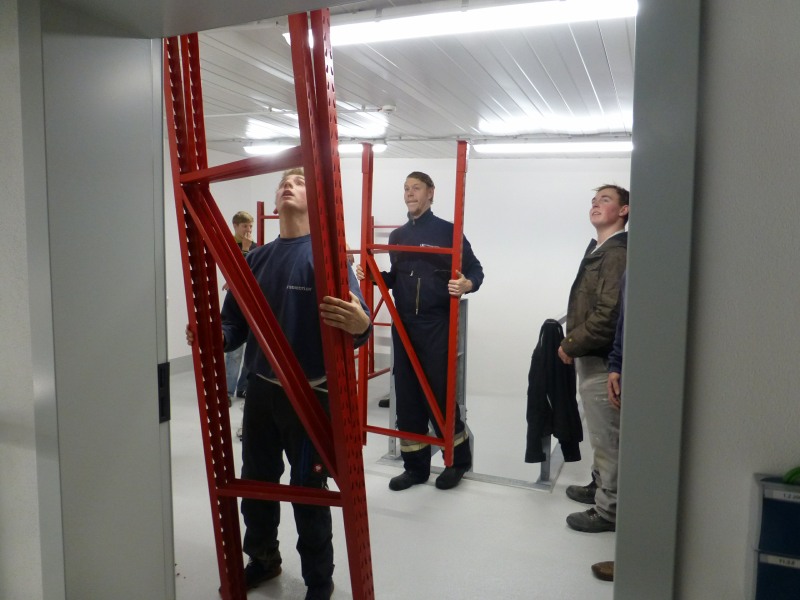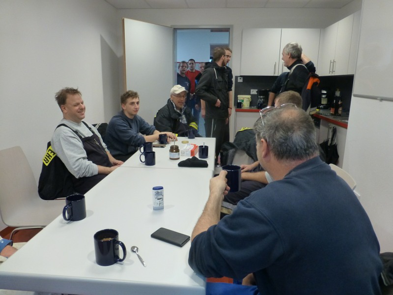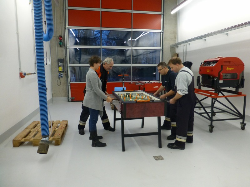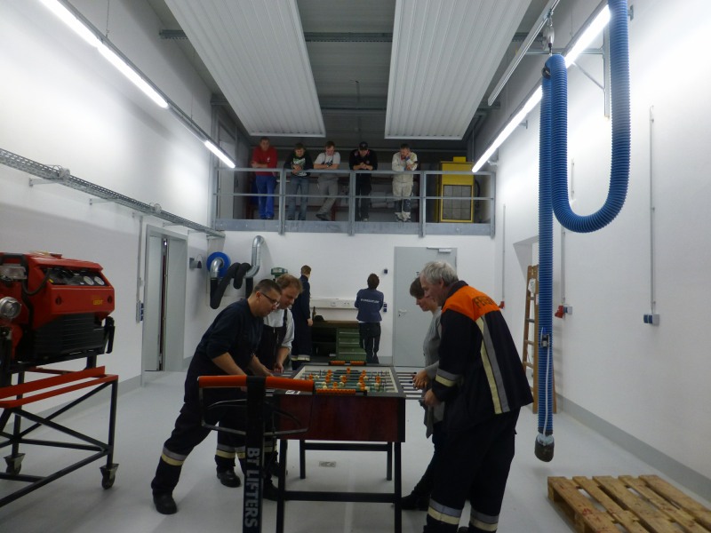 Die Umzugsarbeiten gingen weiter voran. Das Gerüst am Funkmast wurde abgebaut, Regale wurden aufgestellt, Schränke gefüllt. Beschriftungen wurden ergänzt und vieles mehr ... Zwischendurch eine kleine Kaffeepause. Das erste Kickerspiel im neuen Feuerwehrhaus.