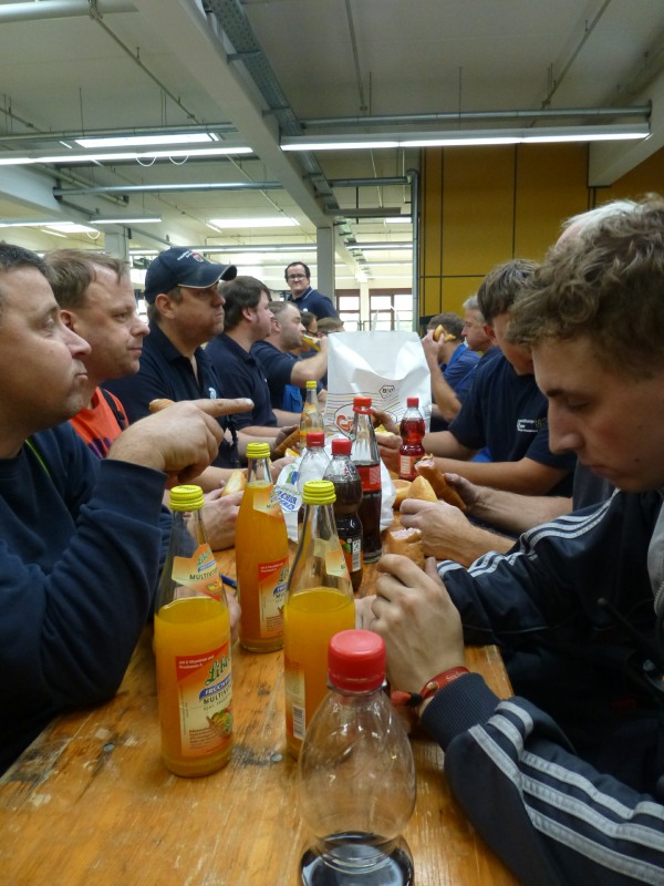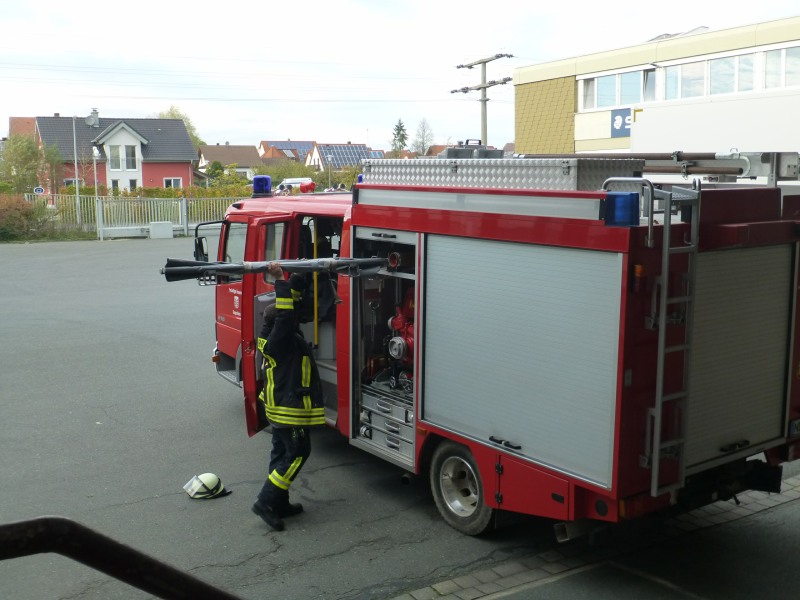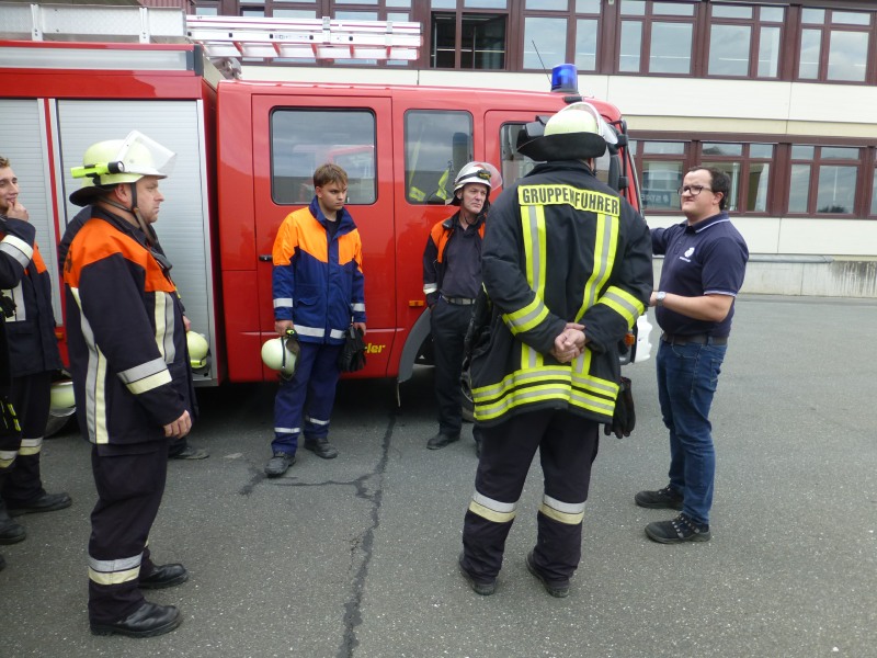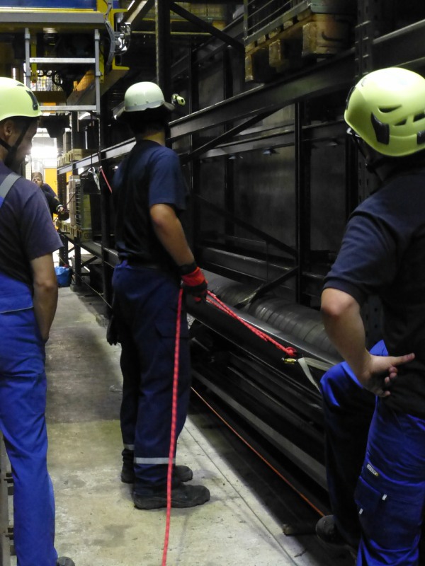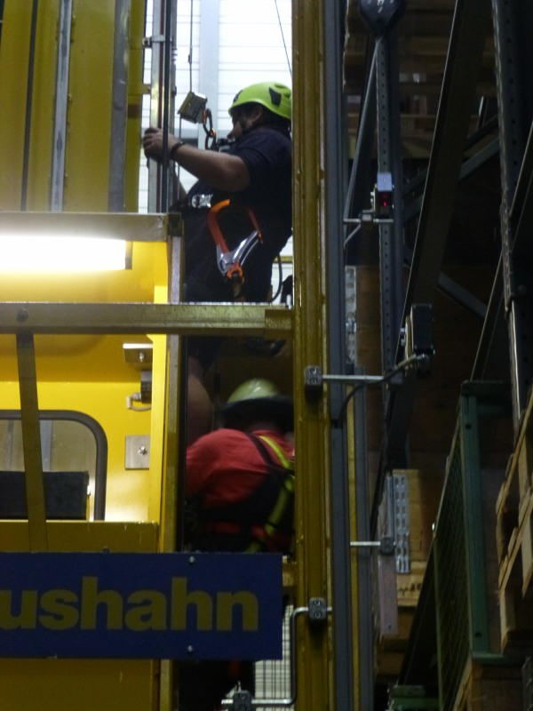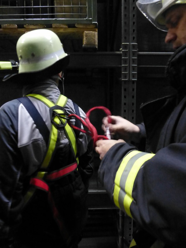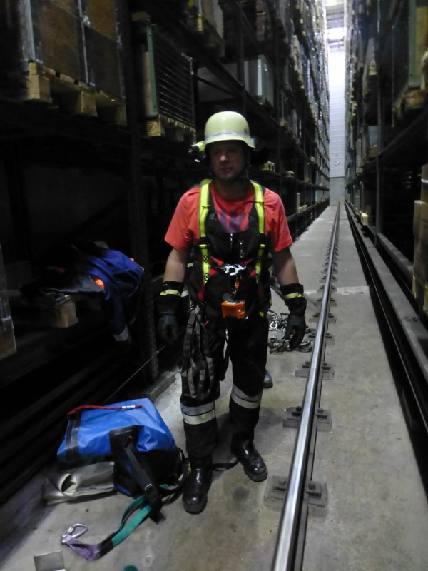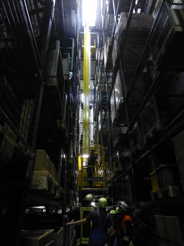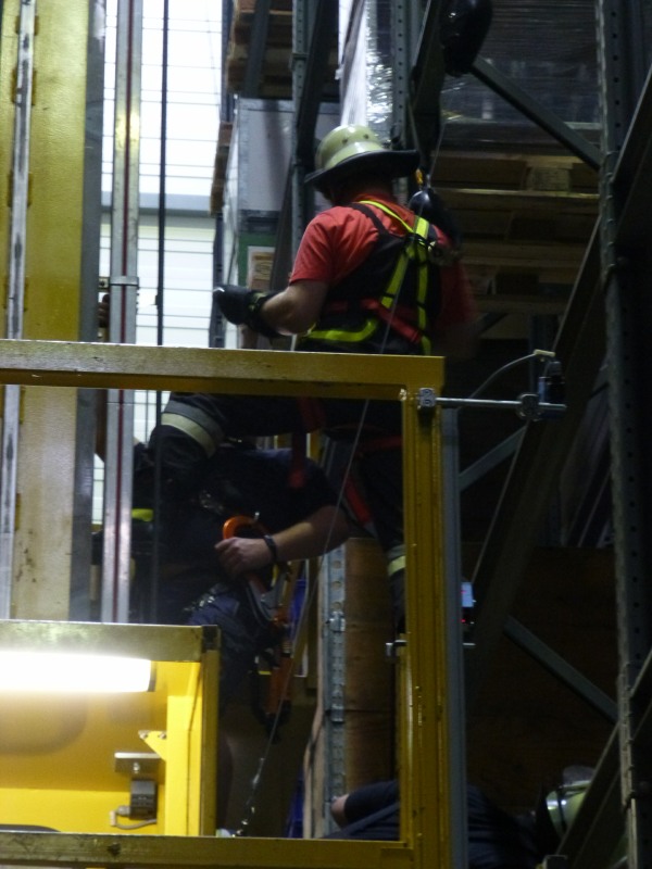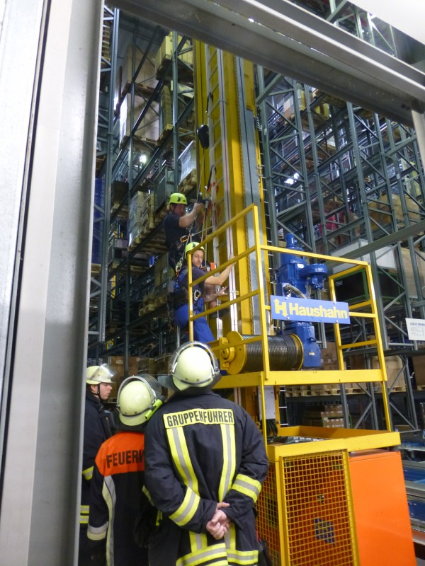 Angenommener Unfall im Hochregallager der Firma Staedtler. Bei der Rettung der verletzten Person arbeiten die ausgebildeten Höhenretter der Firma Staedtler mit den Höhenrettern der Feuerwehr zusammen. Ziel dieser Übung war es, herauszufinden, wo es Probleme gibt und wo die Vorgehensweise geändert oder verbessert werden kann.