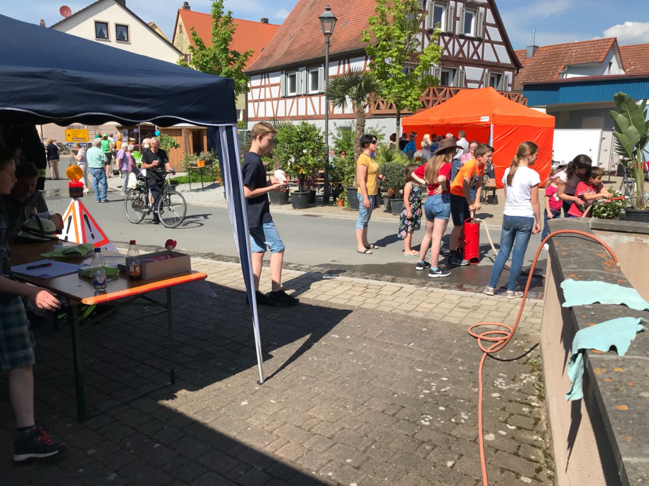 Gar nicht so leicht, mit dem Wasserstrahl der Kübelspritze den Ball auf der Pilone zu treffen und runter zu spritzen. Als Belohnung gab es Cookies.