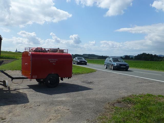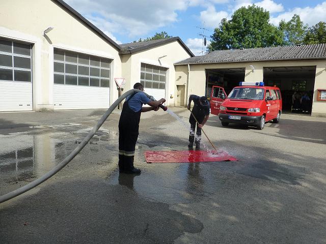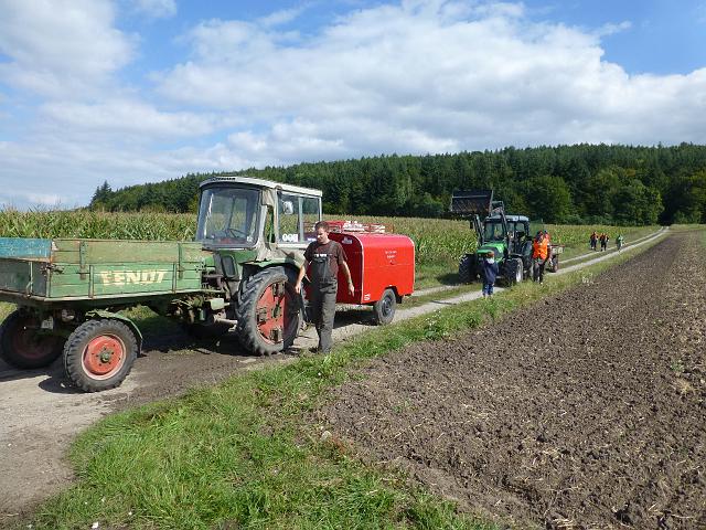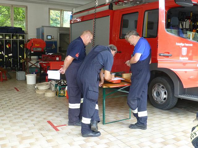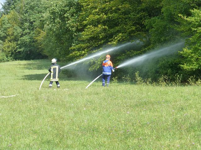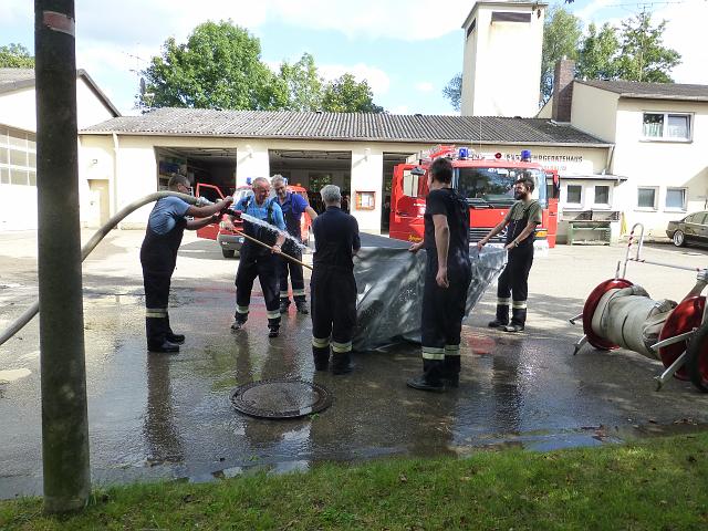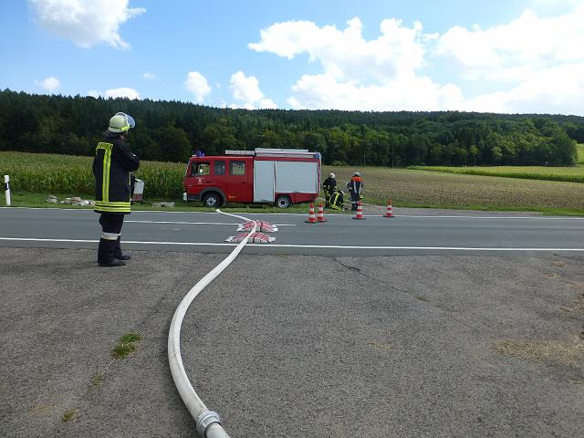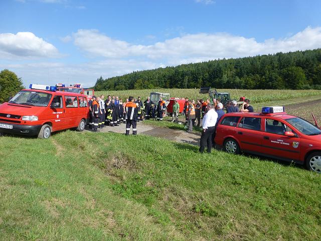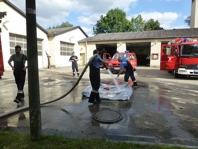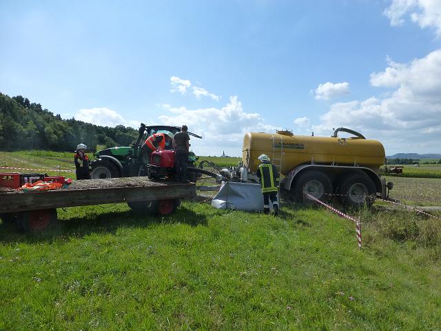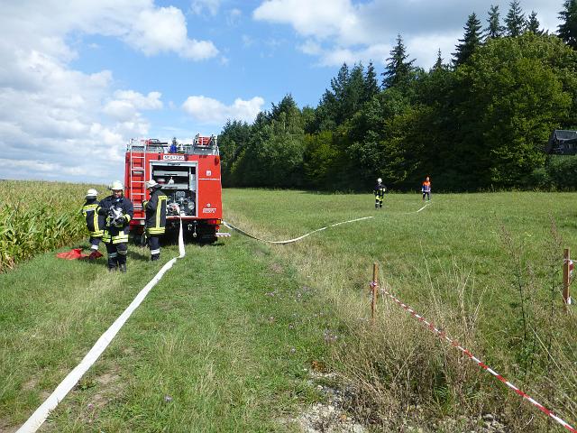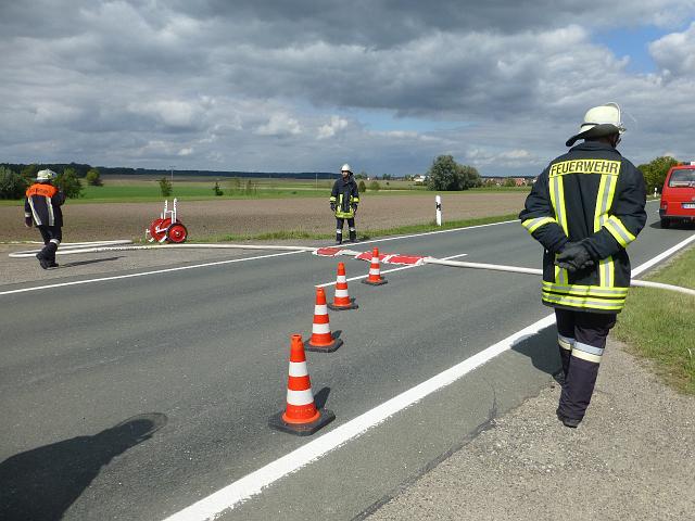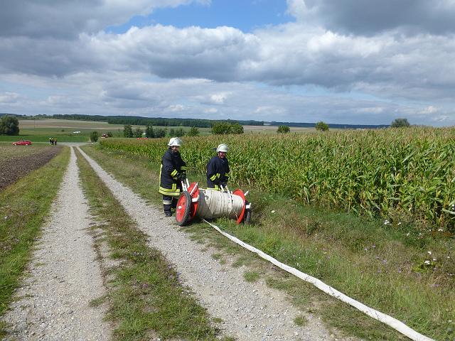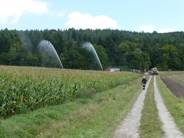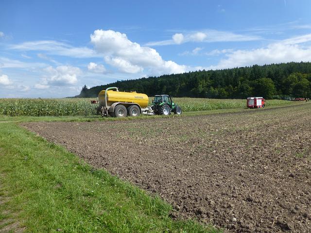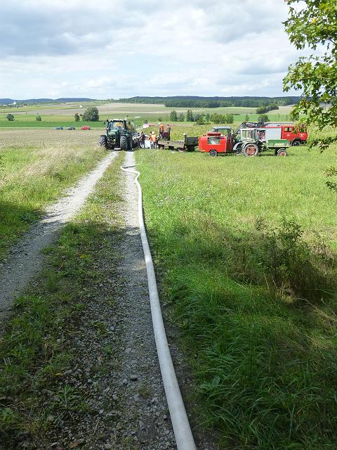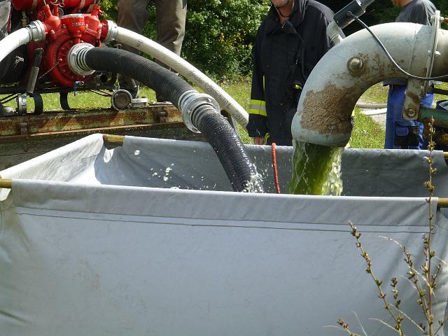 zusammen mit der FF Deutenheim Löschaufbau, Wasserförderung über lange Strecken. Getestet wurde auch die zusätzliche Wasserförderung über den Faltbehälter, der aus Güllefässern befüllt wurde.